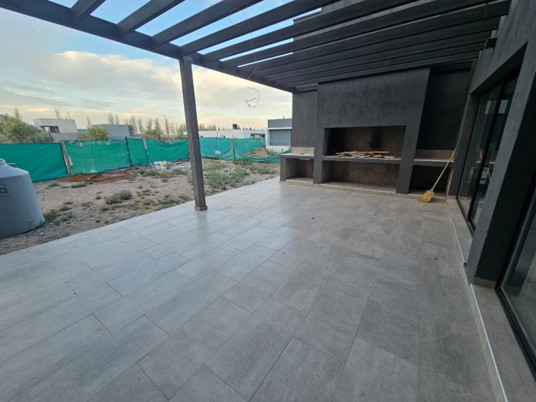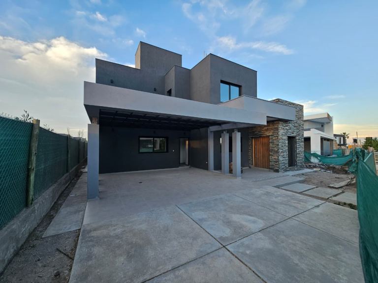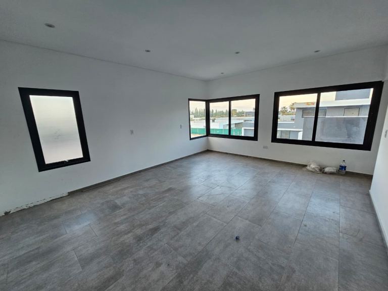 En la planta alta, se distribuyen un baño con antebaño y tres habitaciones con placares. El dormitorio principal cuenta con vestidor, baño en suite y salida a un amplio balcón con hermosas vistas. La casa cuenta con calefacción central por losa radiante, pisos de porcelanato de primera calidad y carpintería de excelencia. Todos los ambientes cuentan con preinstalación para aire acondicionado.